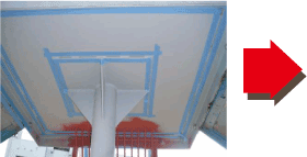- 溶接部を補強し、隙間は水の浸入を防ぐため、 マスキングテープを張ります。 腐食しやすい所にコーキングを打つのは 今までにはない発想です。